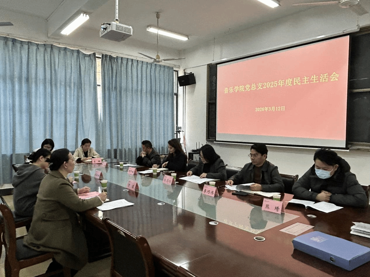 3月12日下午,音乐学院党总支召开2025年度民主生活会。校督导纪委办主任贺革到会指导。党总支书记陈思玥主持会议并作表态发言。全体班子成员参加,科级干部、学生党支部书记列席会议。
