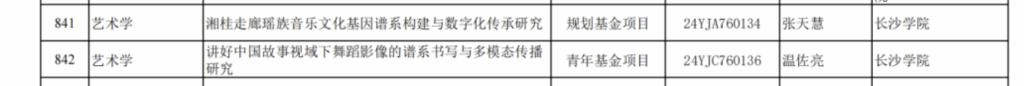 近日,教育部社科司公布了2024年度教育部人文社会科学研究一般项目立项结果。音乐学院张天慧副教授主持的“湘桂走廊瑶族音乐文化基因谱系构建与数字化传承研究”获规划基金项目(24YJA760134);青年教师温佐亮主持的“讲好中国故事视域下舞蹈影像的谱系书写与多模态传播研究”获青年基金项目(24YJC760136)。