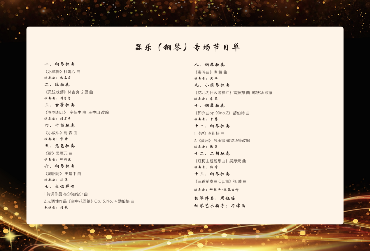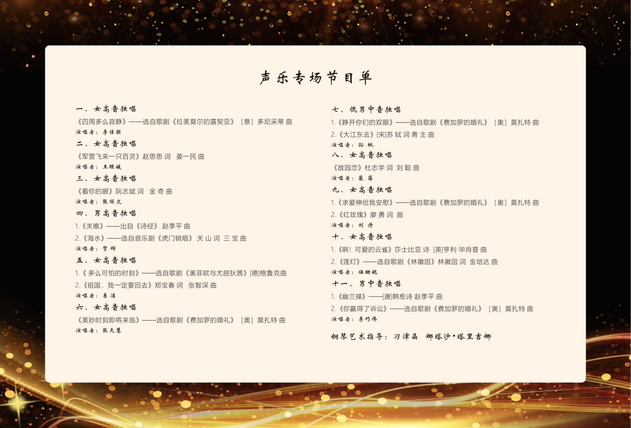 这是一场集声乐与器乐为一体的专业汇报音乐会,表演曲目了汇集了古今中外多首经典作品,包含歌剧选段、艺术歌曲以及各类器乐独奏曲等等。优美动听的乐曲表达出各位教师对音乐的热爱和执着,充分展示了教师们良好的专业素养和艺术风采。此次活动特邀我国著名声乐教育家、旅意男低音歌唱家栾峰先生,湖南省音乐家协会主席邓东源先生,著名湘籍男高音歌唱家虢建武先生前来指导和点评。音乐会受到了专家和老师们的一致好评与认可。
