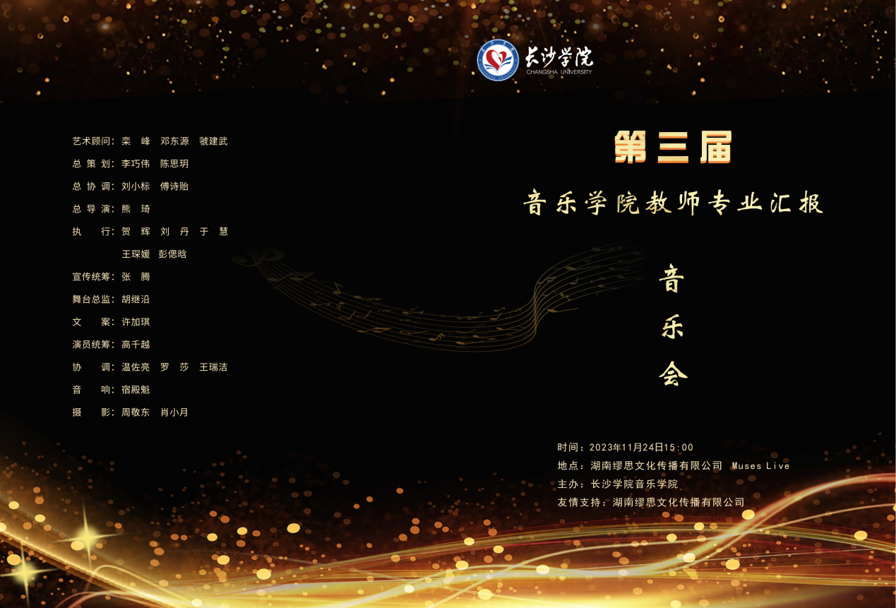 为推进音乐学院“音乐学”国家级一流本科专业建设工作,进一步提高教师专业素养和技能水平,促进教师教学示范能力和专业教学水平的提升,音乐学院于2023年11月24日在缪思文化传播公司小剧场成功举行了2023年度青年教师业务汇报音乐会。音乐学院全体音乐专业教师共同参加了此次专业汇报。
