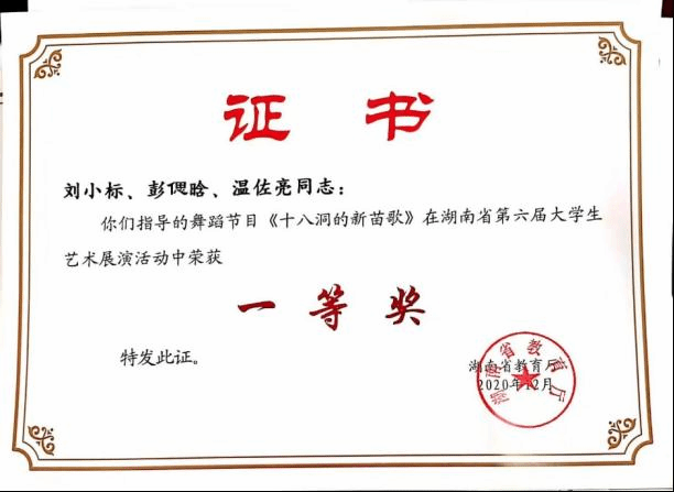 全省第七届青年文化艺术节大赛圆满落幕。根据省教育厅关于举办《全省第六届大学生艺术展演活动》的通知,本赛共评出表演类节目:一等奖103个,二等奖101个,三等奖99个。我院很荣幸在此次大学生艺术展演活动中荣获优秀组织的荣誉,在老师的细心指导下学生的个人技能更加娴熟流畅、基本功扎实稳健、具有艺术感染力并在这次比赛中鼓足干劲迎接了此次比赛。由刘小标老师、彭偲晗老师、温佐亮老师指导的舞蹈节目《十八洞的新苗歌》在湖南省第六届大学生艺术展演活动中荣获了一等奖;由刘丹老师、王琛媛老师、贺辉老师指导的《棒棒锤在岩石上》在此次比赛中荣获了二等奖,他们也获得了优秀指导教师奖。为认真总结经验、巩固成绩、进一步发挥典型带动和示范引领作用,我们应再接再厉取得更好的成绩。