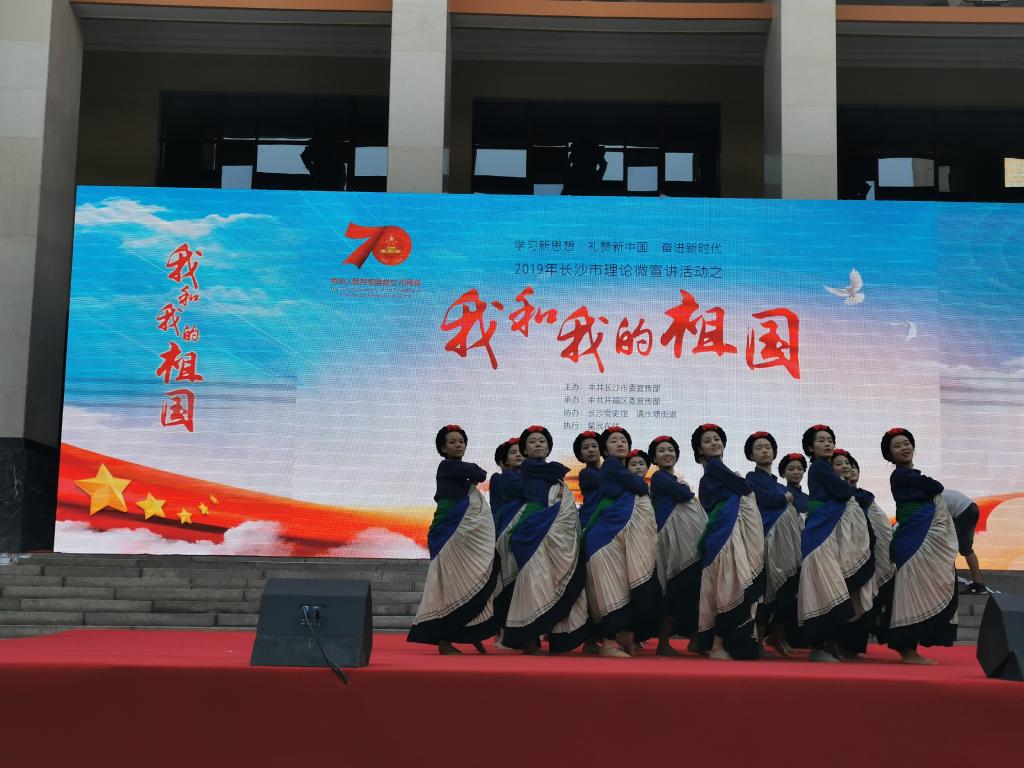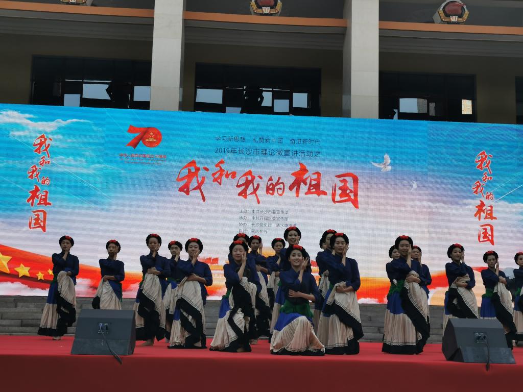 为进一步激发广大群众的爱国情怀与自强不息、奋发向上的自豪感,长沙市委宣传部主办、开福区委宣传部承办的“学习新思想 礼赞新中国 奋进新时代”2019年长沙市理论微宣讲活动之“我和我的祖国”专题赛活动于9月29日上午在中共湘区委员会旧址(长沙党史馆前坪)进行,我院2018级舞蹈学1班受邀表演彝族群舞《情深谊长》。