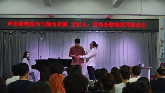 周浩老师讲述了声乐演唱技巧的精髓,从呼吸控制、发声方法到情感表达为大家剖析。同时,他还深入讲解了舞台表演的要点,包括肢体语言、表情管理以及与观众的互动,带大家领略歌剧歌曲在舞台上的独特魅力。