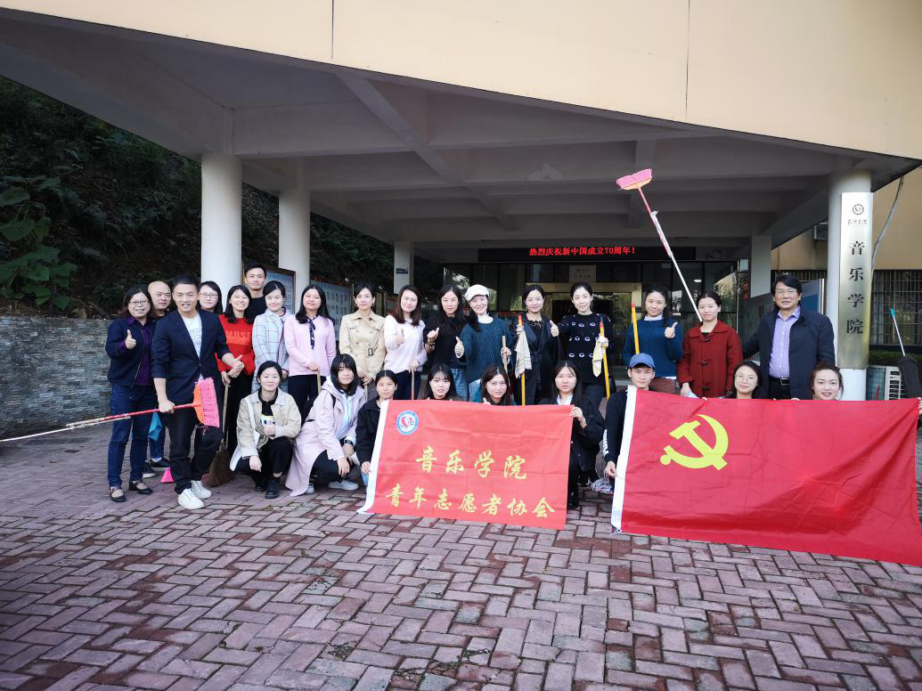 金秋十月,举国同庆。为营造校园整洁优美、文明祥和的氛围,号召党员发挥好先锋模范作用,10月29日,音乐学院结合“不忘初心、牢记使命”主题教育,组织党员、师生共同参与清洁校园大扫除活动。