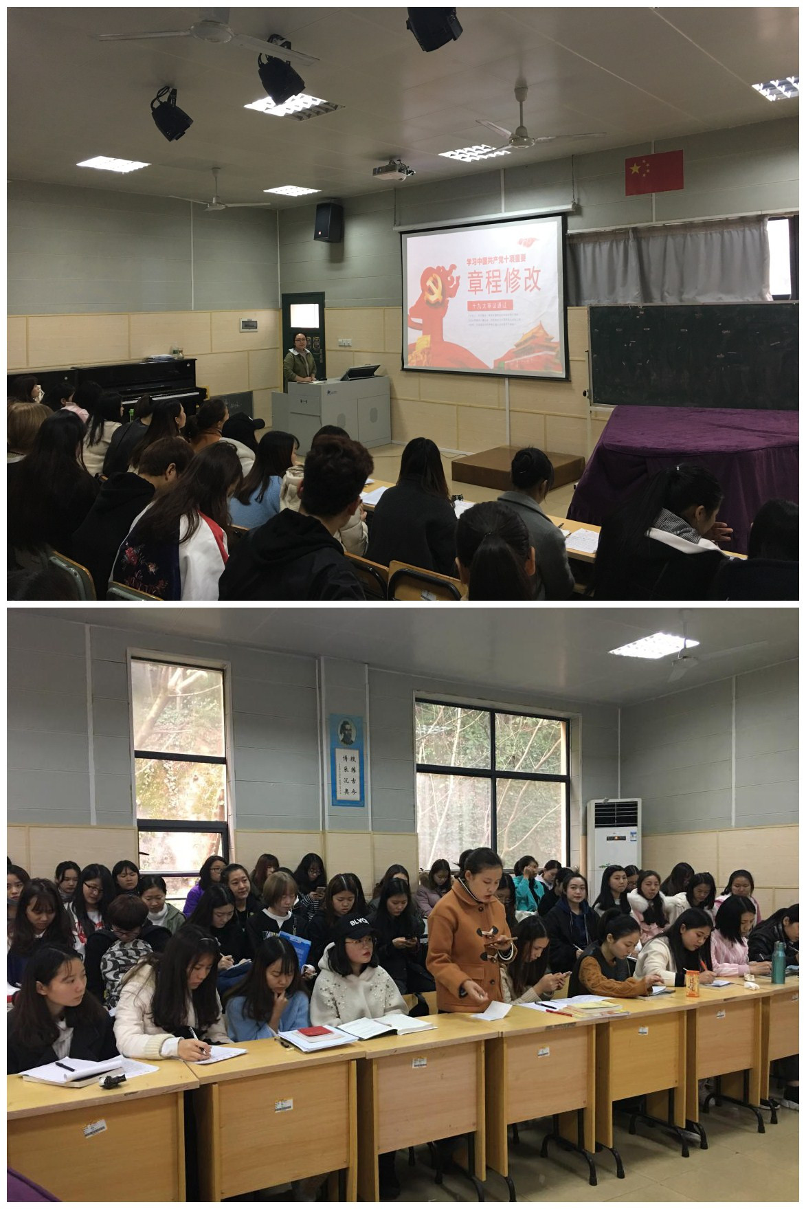 学生党支部书记李璇对本次活动的主题及内容做了简要介绍,并对新进积极分子近期表现做出评价,指出其有待改进的地方;然后,苏杨琼、文玉婷等同学跟大家一起分享了党的十九大会议相关资料。其中文玉婷分享了在十九大会议报告中"历史方位"、"两个不改变"等几大重点,同学们深受教益。接着,入党积极分子们一起学习新修党章,刘乐、张润等同学发表了学习的心得体会。