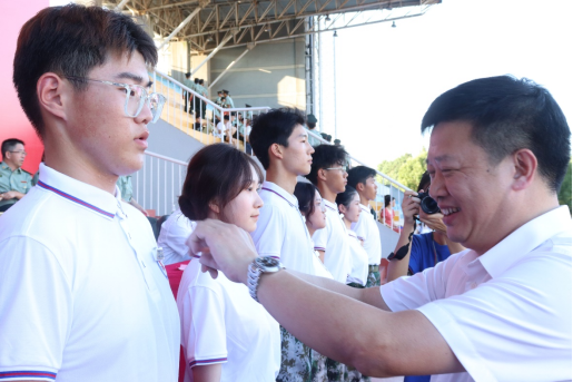 党委副书记汤文胜为新生代表佩戴校徽,希望全体新生承载起“崇德求真、实干担当”的长大精神,承载起长大人的使命与荣光。
