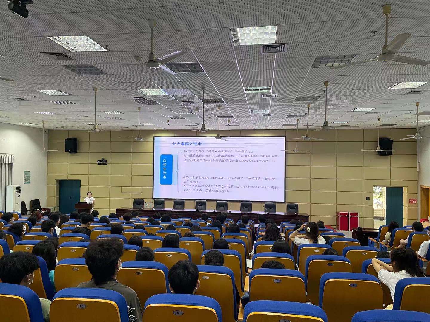 副院长谢萍、舞蹈专业教师温佐亮分别就音乐学和舞蹈学专业的培养目标、主干课程、就业前景以及专业实践与社会实践进行了详细介绍。谢院长还教导同学们要树立自主学习意识,加强自我管理,要求同学们立足当下,确定好人生目标,为迎接美好的未来努力实践。随后,《长大之歌》优美的旋律声响起,副院长谢萍教授上台为新生代表佩戴校徽,同时,台下同学们全体起立,共同佩戴校徽。戴上校徽,至此已正式成为一名“长大人”。