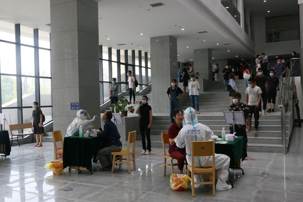 核酸检测工作在学生活动中心外厅顺利进行,全体校领导带头参加。参加核酸检测的教职员工经过测量体温、查验健康码和行程码后方可进入候检区,按照工作人员指引,有序排队进入信息登记区进行信息登记,之后进入采样区接受采样,采样结束后按照标识指引离开检测点。