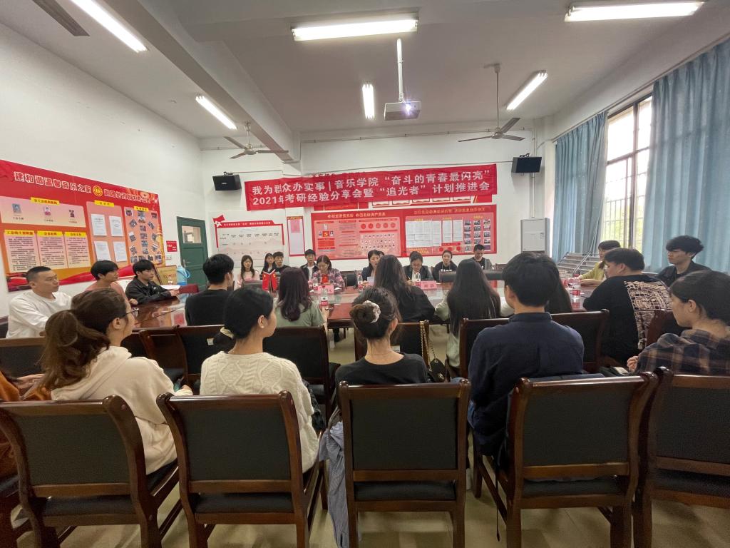 5月25日下午,音乐学院在音乐楼105会议室召开“奋斗的青春最闪亮—我为群众办实事”2021年教研经验分享会暨“追光者”计划推进会。党总支书记陈滨滨、党总支副书记刘静、学院关工委副主任刘利元、教研室主任贺辉、2021届考研上岸学生代表、准备考研学生、“追光者”计划学困一对一帮扶代表等参加。本次会议根据深化党史学习教育,落实“我为群众办实事”要求,以“精抓两头带学风”为抓手,办实事,解难题,以学困生为重点,以考研就业出口为契机,用实际行动帮扶促学,切实促进优良学风建设。会议由辅导员张腾主持。