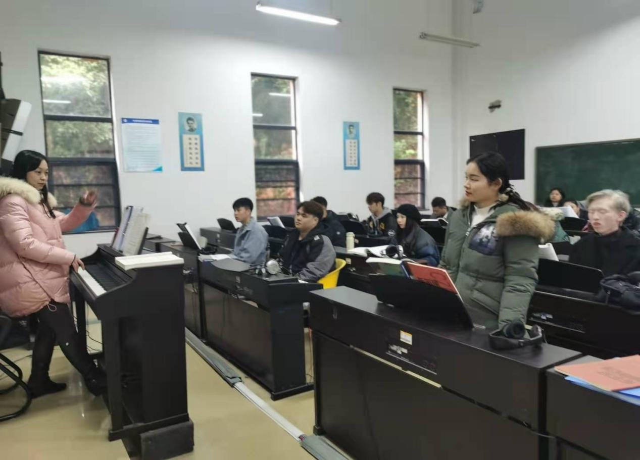 接着由刁津晶教师主讲钢琴即兴伴奏与实践课程——大调中正三和弦的使用,刁津晶老师教态大方得体,自然,具有亲和力,授课层次分明。本堂课由学生配合弹唱《送别》展开本堂课的内容,接着由浅入深,从如何使用正三和弦为大调音阶编配伴奏,到学会用三种不同的基本伴奏音型赋予旋律不同的性格,最后以学生配弹《送别》呈现结束整堂课。