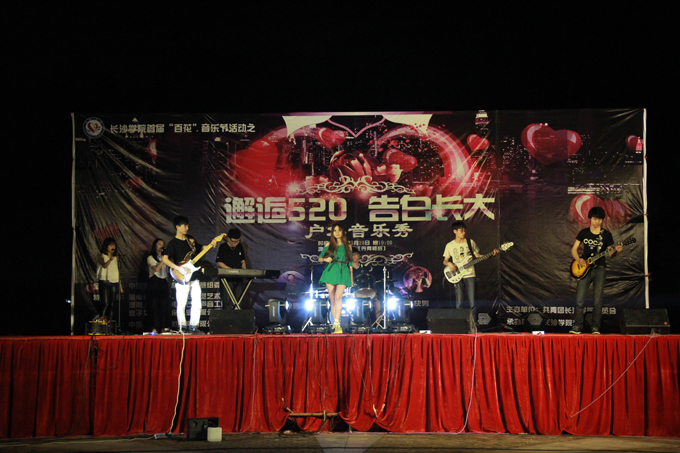 音乐秀上不仅有来自音乐系学子用心的表演,还有我校乐队的倾情加盟,更有湖南首届金音杯歌手大赛金音奖得主罗元臣,中国好声音湖南赛区总冠军王萍,湖南广播电台金鹰955音乐主播李金伶,新生代90后原创歌手王谨轩为大家带来了精彩演出。在充满激情的歌声中,本次"邂逅520 告白长大"主题户外音乐秀圆满落幕。