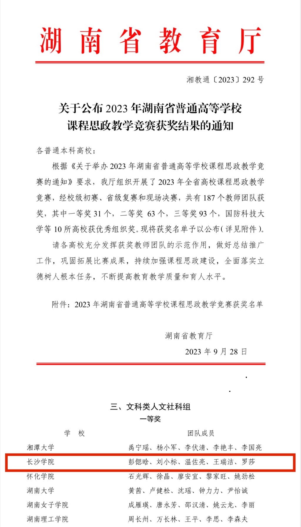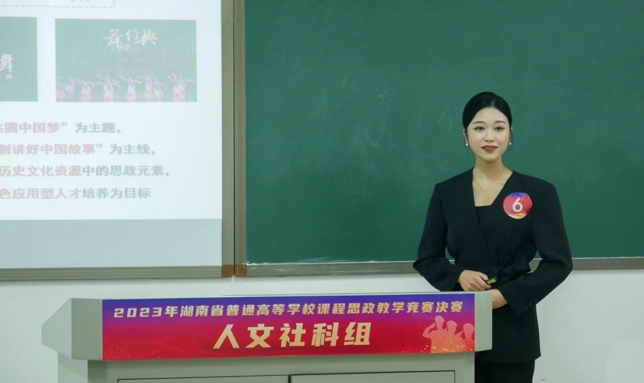 9月23-25日,由湖南省教育厅主办,湖南省高等教育学会教学管理专业委员会承办的2023年湖南省普通高等学校课程思政教学竞赛决赛隆重举行,来自湖南省各高校的94个教学团队同台竞技。经过紧张激烈的角逐,我院彭偲晗老师团队荣获一等奖。