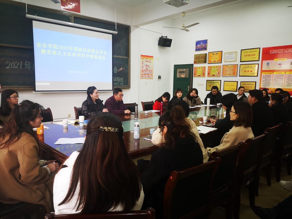 2022年1月13日下午,音乐学院召开2022年国家社科基金项目与教育部人文社科项目申报推进会,会议由主管科研工作的刘小标副院长主持,音乐学院全体教师参加。