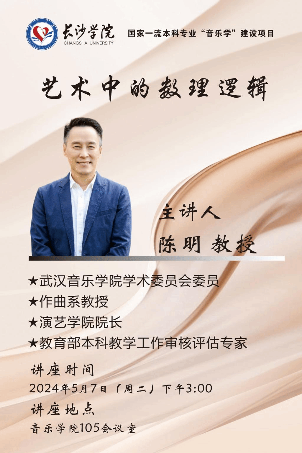 5月7日下午,音乐学院特邀武汉音乐学院演艺学院院长、教育部本科教学工作审核评估专家陈明教授来我院调研与指导,并开展题为《艺术中的数理逻辑》的主题讲座。讲座由音乐学院院长李巧伟主持,全体教师参加了此次会议。