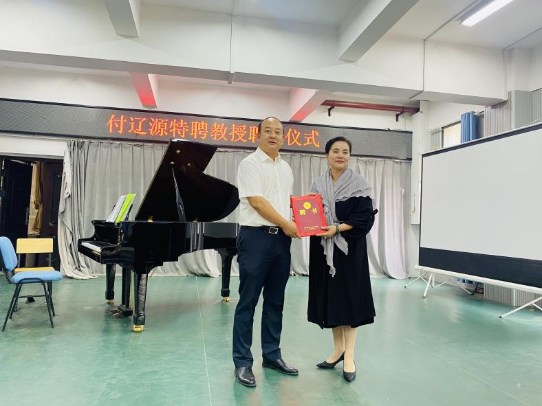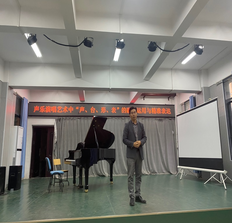 讲座之前,长沙学院副校长曾广胜为付辽源教授颁发长沙学院特聘教授证书。随后讲座开始,首先,付辽源教授跟大家讲述了自身多年的工作和演艺经验,向大家讲述了在声乐演唱艺术中,“声”要通透,松而不虚;“台”要有气场,女生应端庄优雅,男生应大气阳刚,要有气质,仪表堂堂;“表”则要生动,眼神要凝而不散。其次,付辽源教授对我院三名学生进行了一对一的演唱实践指导,强调了在表演中眼神要有神,脑中要有画面,情感要有共情力和感染力,让学生体会到如何在舞台上收放自如,三名学生及在座的师生都受益匪浅。
