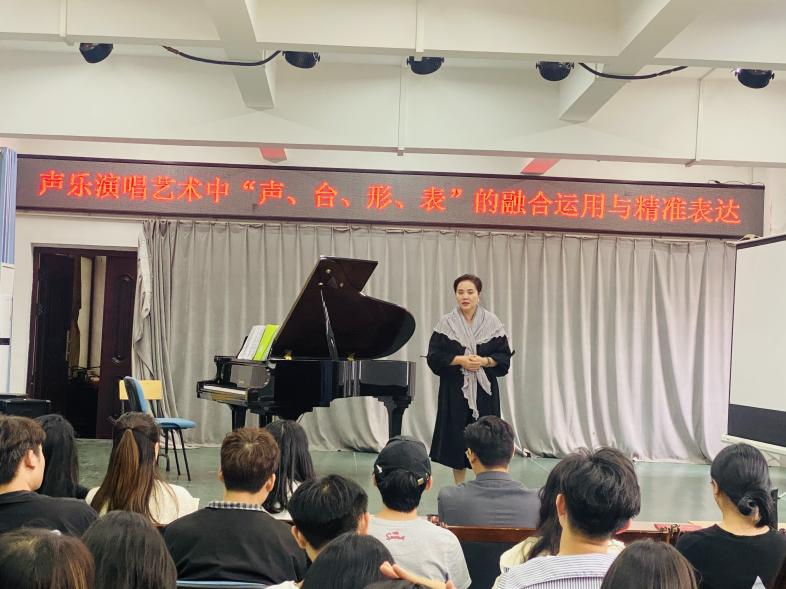 2022年11月4日下午,著名女高音歌唱家付辽源教授来我院讲学,在音乐楼109教室进行了题为《声乐演唱艺术中“声、台、形、表”的融合运用与精准表达》的声乐讲座。音乐学院党政领导班子、全体声乐老师及学生参与了本次讲座。