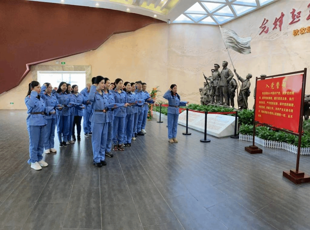 在秋收主义纪念馆前,师生党员们换上朴素的红军服装,党总支书记陈滨滨同志带领在场的全体党员重温入党誓词。同志们举起右臂,仿佛又回到了当年入党宣誓的庄严时刻,心灵受到一次洗礼。