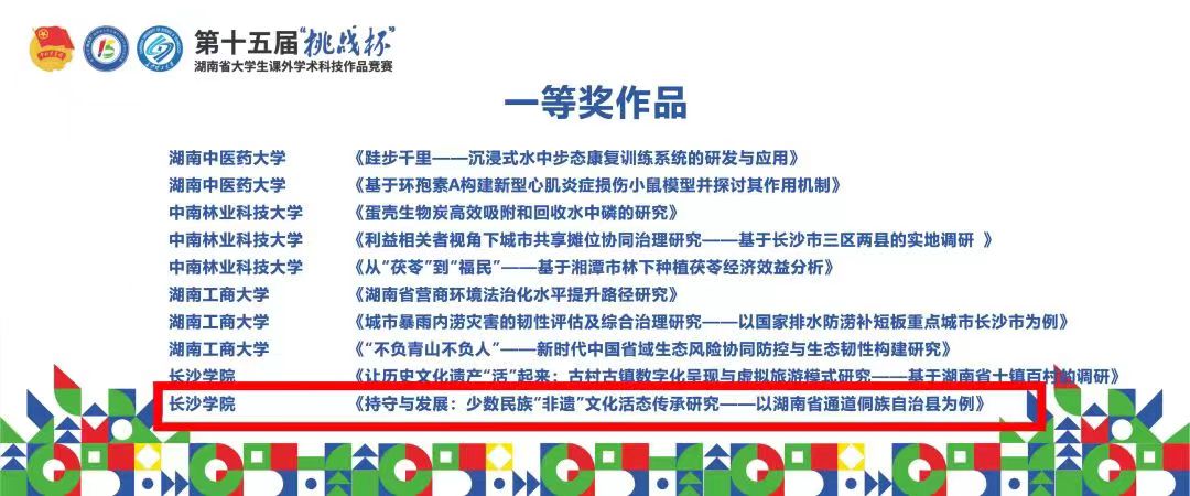 5月20日至5月22日,由共青团湖南省委、省教育厅、省人力资源和社会保障厅、省科学技术协会共同主办的第十五届“挑战杯”湖南省大学生课外学术科技作品竞赛决赛在长沙理工大学落下帷幕。由我院李璇老师指导,学生瞿家兴、丰一帆、石建成、胡奇楠合作完成的作品《持守与发展:少数民族“非遗”文化活态传承研究——以湖南省通道侗族自治县为例》经过层层选拔、一路过关斩将,出色完成终审答辩,在本届“挑战杯”赛事中荣获一等奖,该作品将代表学校参加今年下半年在贵州大学举办的第十八届“挑战杯”全国大学生课外学术科技作品竞赛。