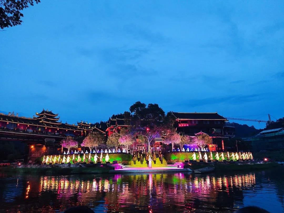 行歌坐月,古梦清泉。众声复调,千年侗音。晚上,在皇都侗文化村坪坦河畔,辛劳的“排练人”终于可以转换成“观演人”了,大家一起观摩大型侗寨山水实景演出——戊梁歌会。