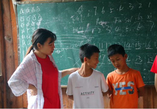 在都天村,今天我们提升了侗族民歌在演唱发声与音色等方面的要求,并取得良好效果。为更好地展开《迷人的火塘》教学,我们增加了音阶训练,并引导孩子们在歌曲的律动中感受音乐。除此之外,还引导孩子们在表现歌曲内容时进行情感化处理。课堂接近尾声,虽是短短三天,可我们与这些娃娃之间恰似有了另一种情缘……