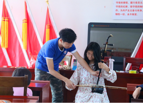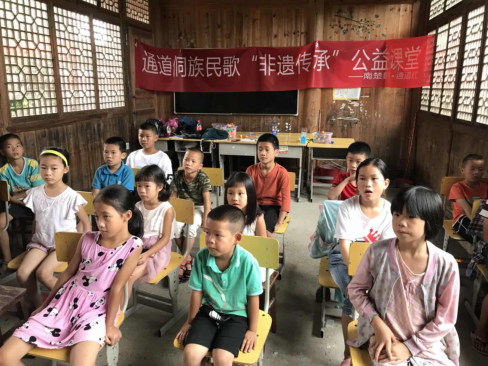 在都天村,在侗族民歌学唱的基础上,今天的教学内容增加了节奏训练与歌唱的气息练习。小朋友对教学内容倍感好奇,每人都竖起耳朵,聚精会神听讲,并认真完成练习。为提升小朋友们的音乐鉴赏能力,我们通过二胡演奏的现场示范,引导孩子们了解二胡的基本构造和发声原理,并通过二胡演奏来进行“听歌识曲”,孩子们争先恐后的举手猜歌,现场气氛欢快、活跃。