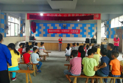 都天村,由上都天村与下都天村合并而成,是坪坦乡规模较大的村落。今天的公益课堂地点设在村部的会议室,我们迎来了37位小朋友。有别于皇都村孩子们的活波、开朗的性格,都天村的孩子们表现出文静、怯弱的特点。为提高孩子们的学习兴趣,活跃课堂气氛,并获得较好的个性解放,我们借轻松、愉快的自我介绍环节,主动给孩子们展示才艺。之后,通过侗族民歌的教唱,师生与孩子们逐渐产生较默契的教学互动。